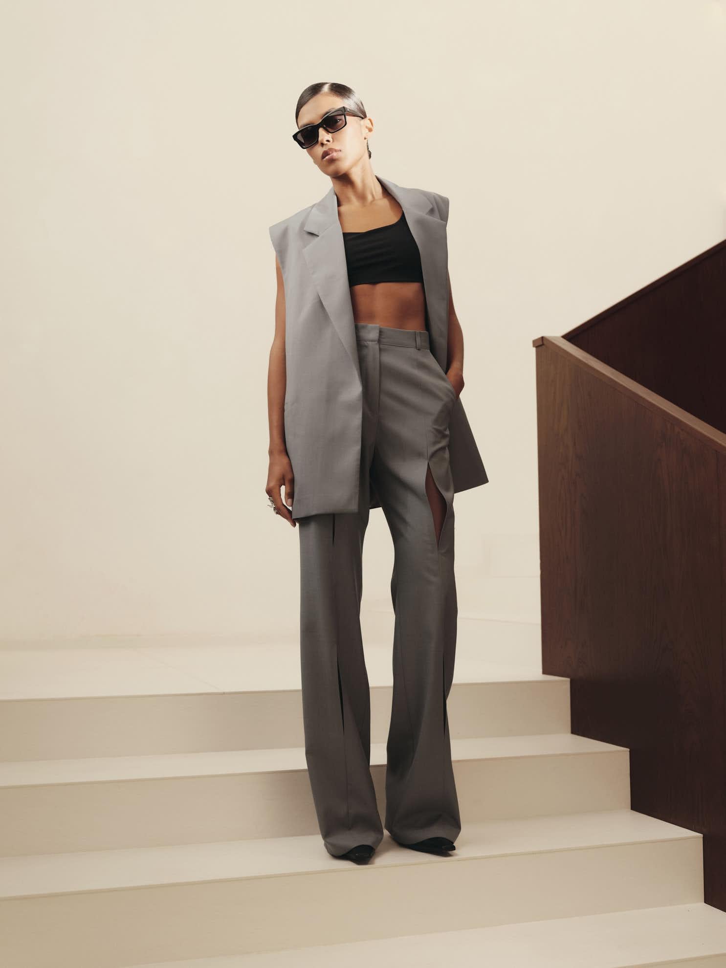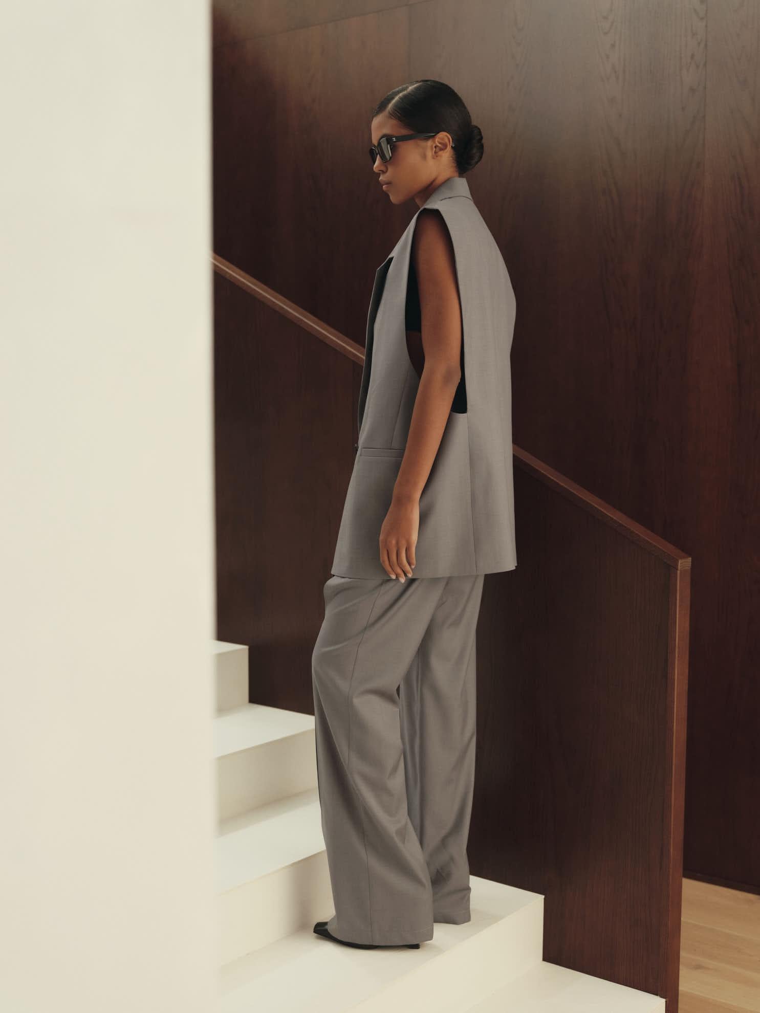 Two-piece virgin wool contemporary fit set with accent cut-out sleeveless jacket and pants